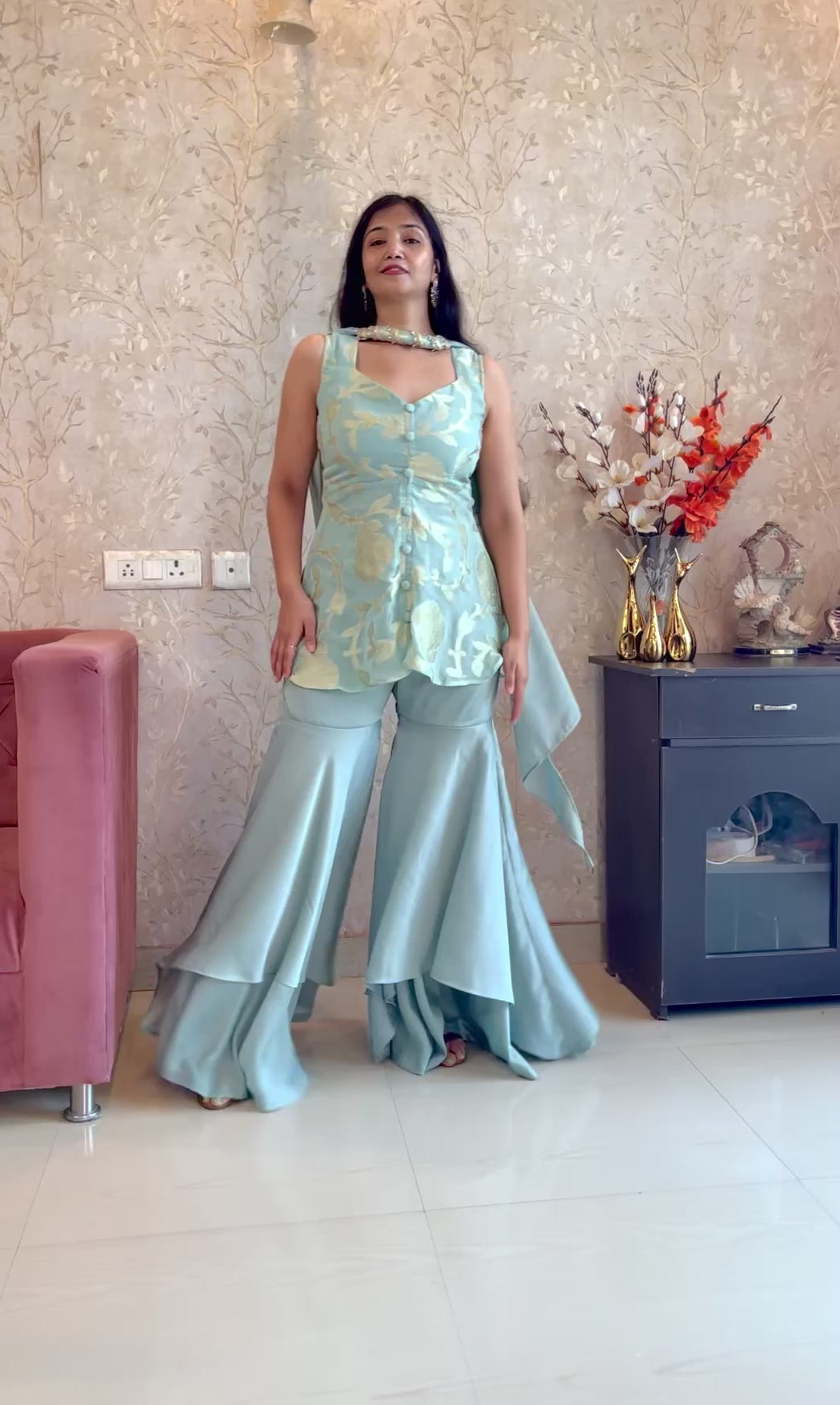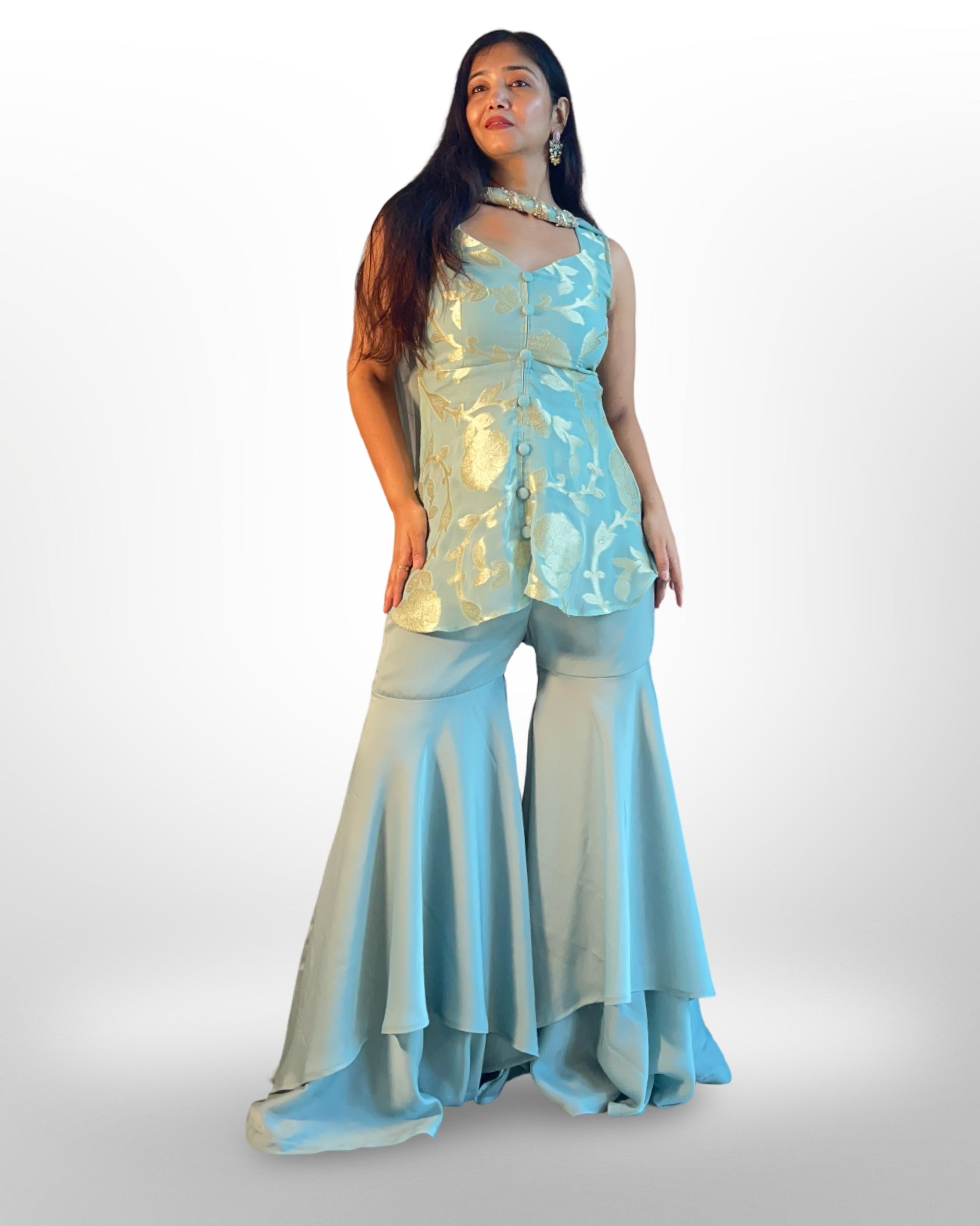 Elevate your wardrobe with this expertly crafted Indo-Western ensemble featuring layered Garara pants in crepe brocade georgette paired with a chic short tunic kurta. The lightweight, textured fabric offers graceful movement and a modern silhouette, while the accompanying trendy dupatta adds a refined finishing touch. Perfect for festive occasions or contemporary celebrations, this outfit blends traditional craftsmanship with stylish design for a sophisticated, confident look.