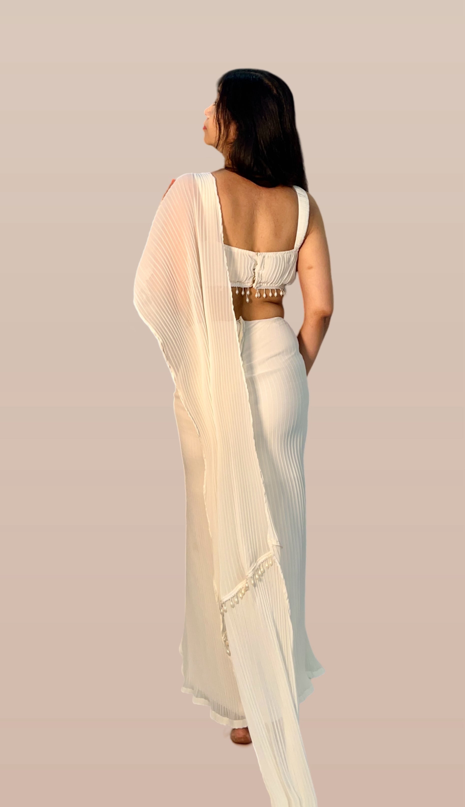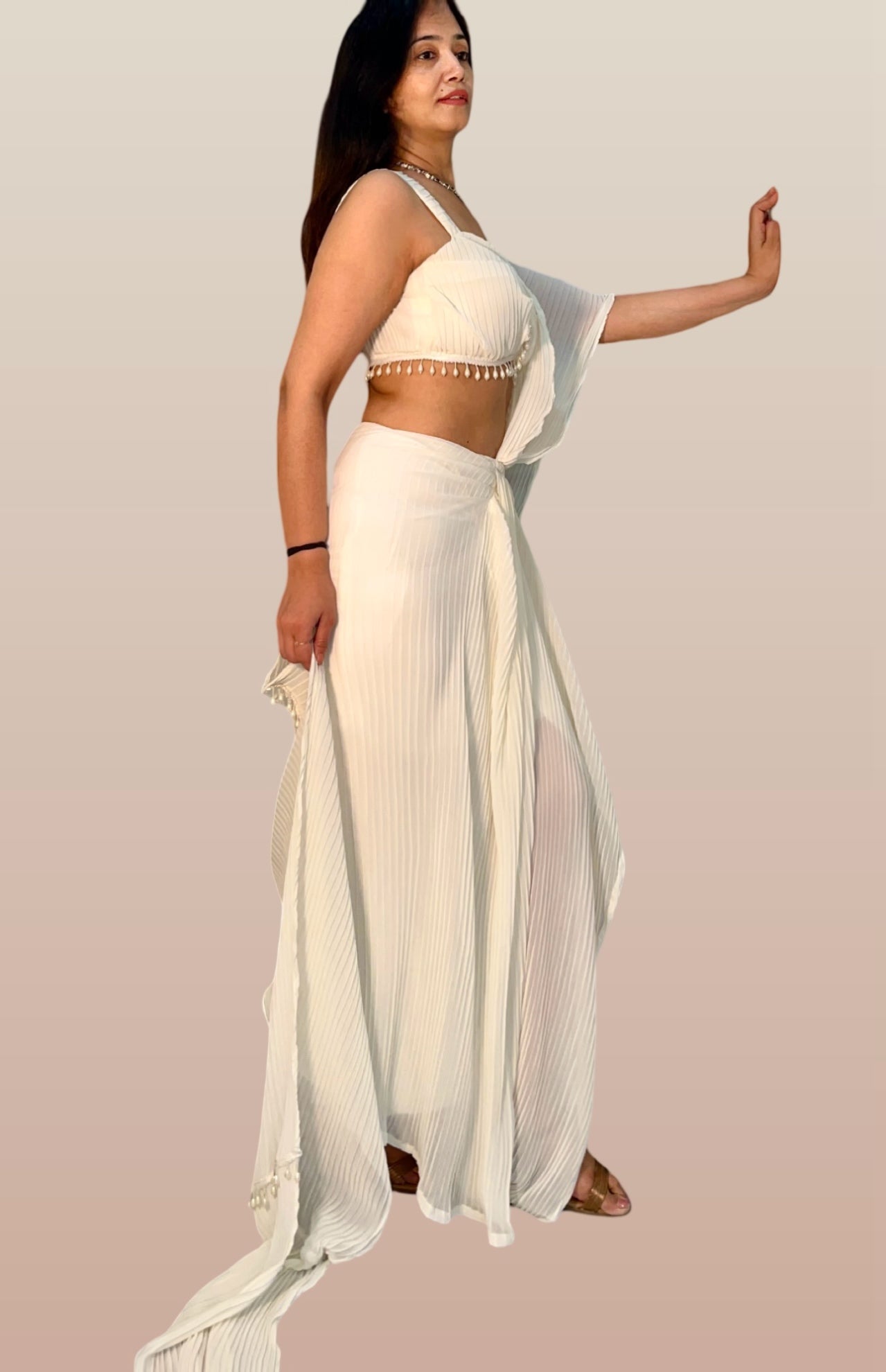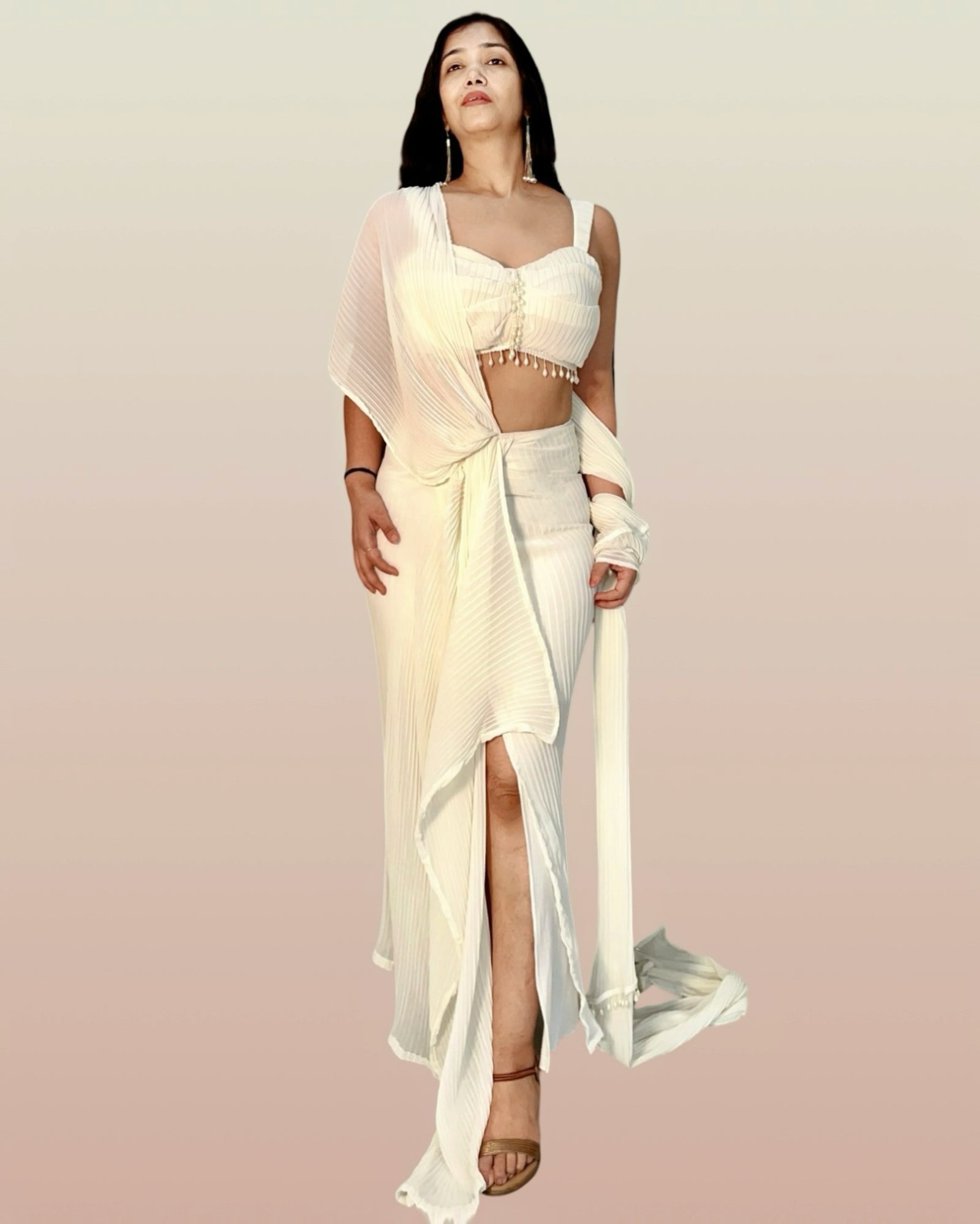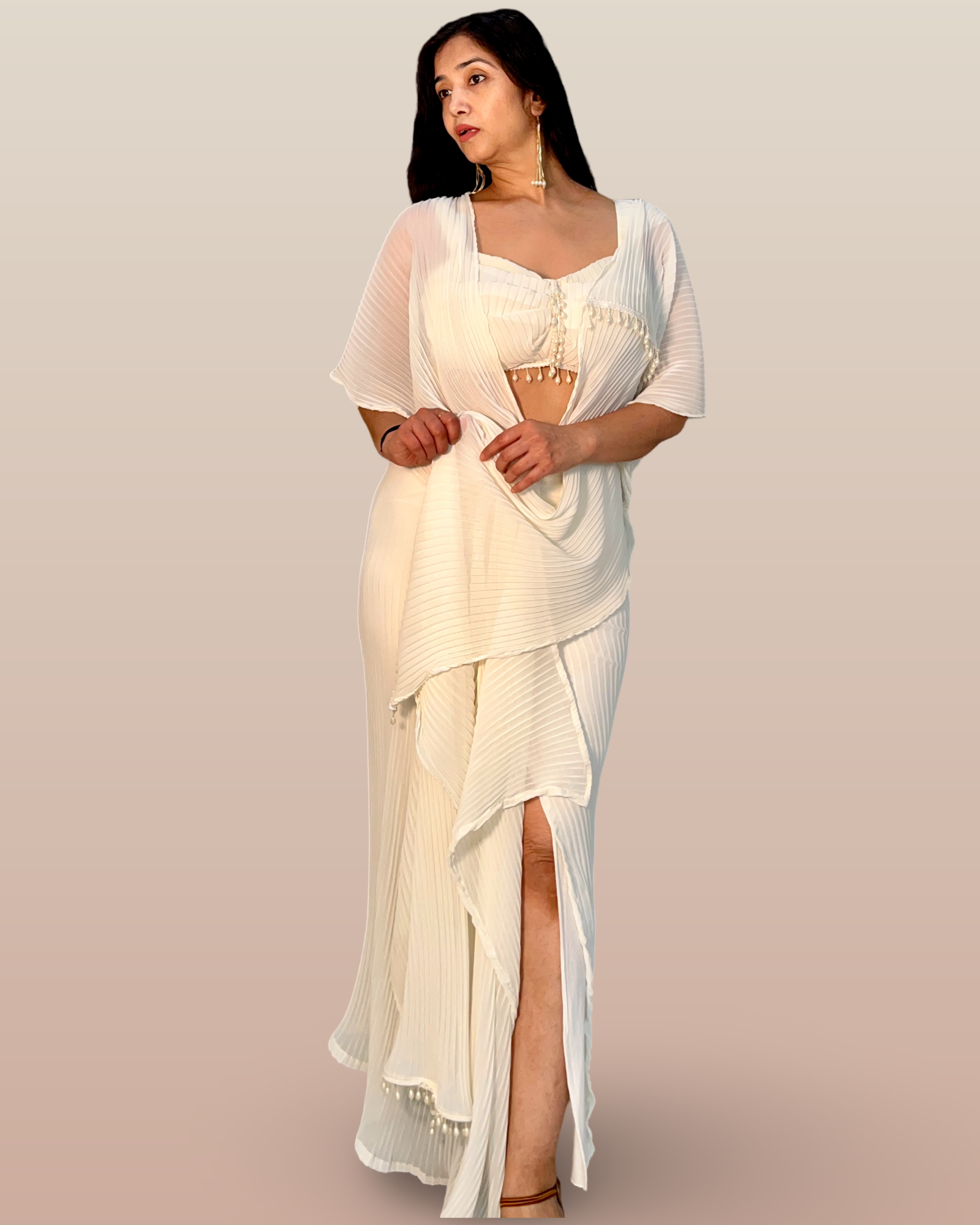 This ivory draped saree ensemble features a pre-stitched modern design crafted from pleated georgette fabric for effortless elegance. The blouse is adorned with exquisite pearl lace bustier detailing, perfectly complementing the saree pallu. Its off-white hue and refined texture make it an ideal choice for sophisticated occasions, combining contemporary style with traditional grace.