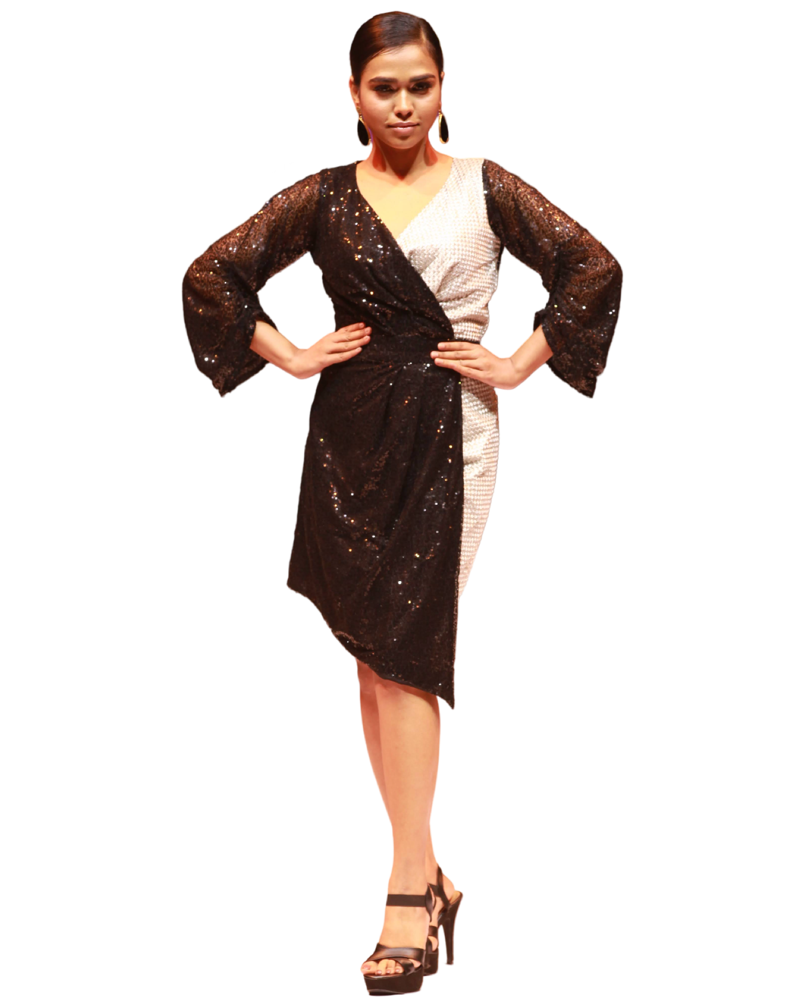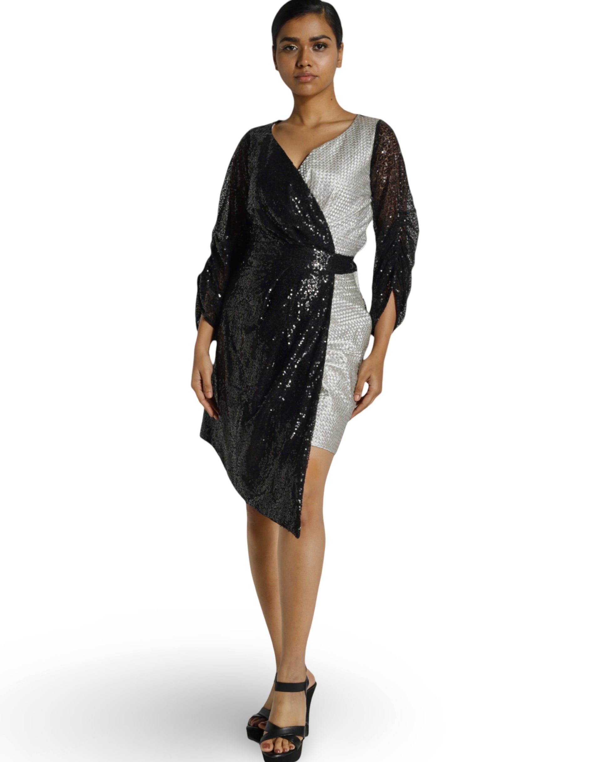 This knee-length party dress features a sophisticated overlapped design, combining shimmering black sequins with contrasting silver brocade. The blend of textures creates a striking visual appeal, perfect for elegant evening events. Its tailored fit enhances your silhouette, making it an ideal choice for those seeking a refined and glamorous look.