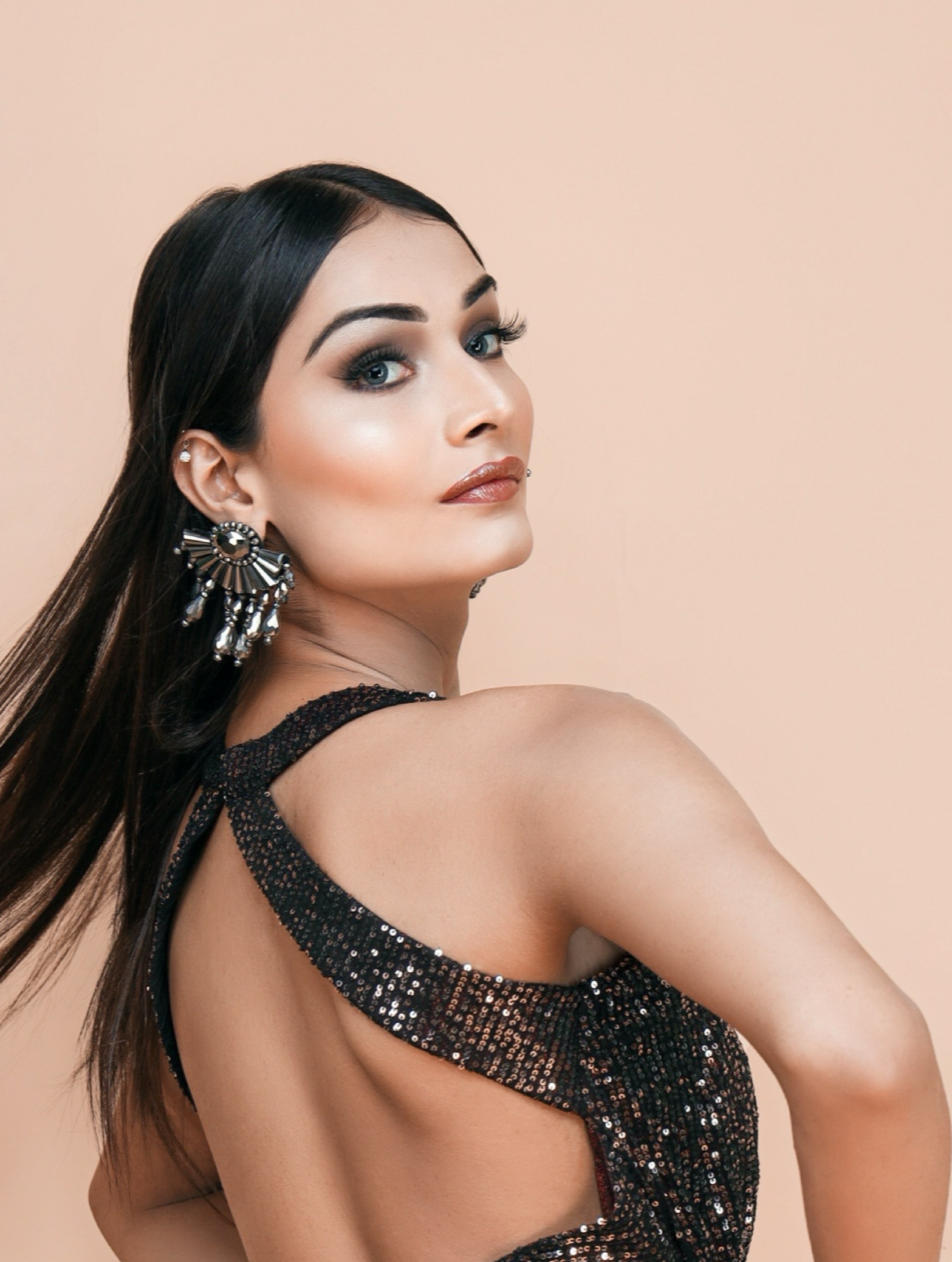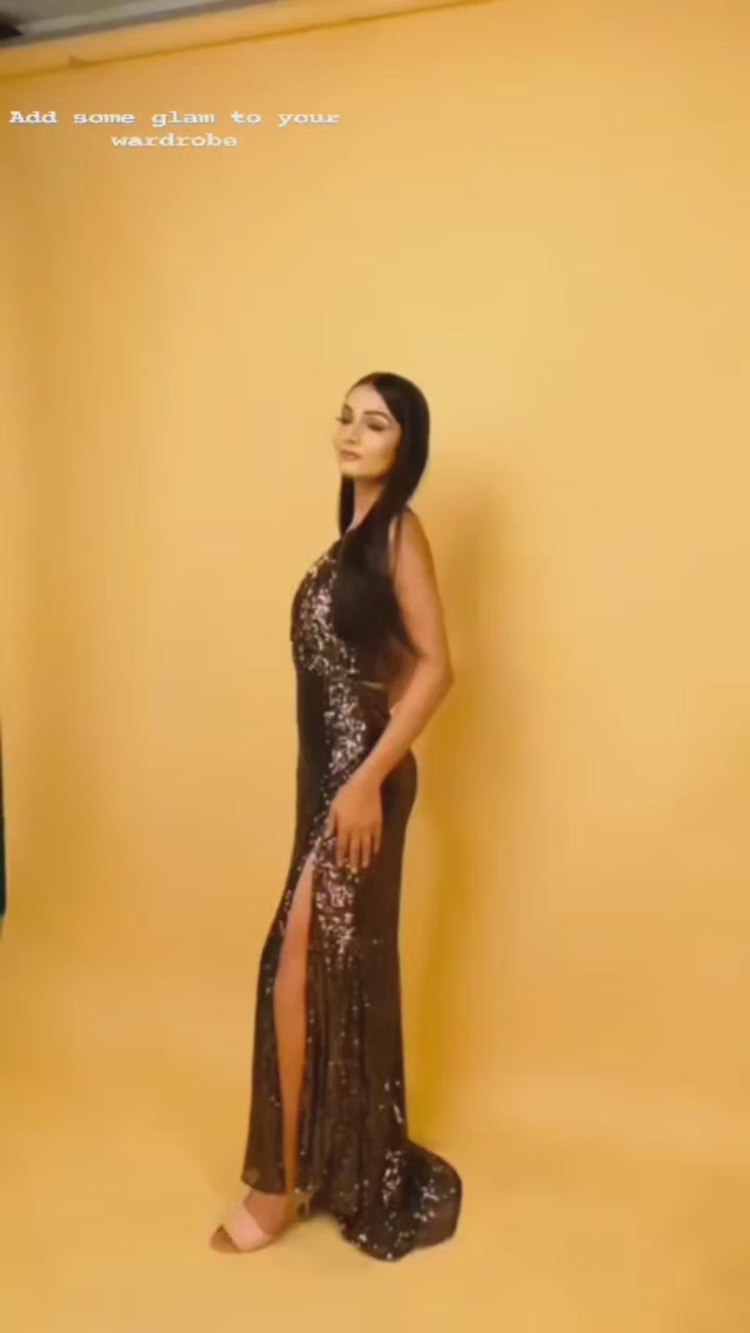 This exquisite party wear gown features shimmering golden sequins intricately embroidered on a black net fabric, creating a striking glam look. Designed with a daring backless silhouette and a thigh-high slit, it offers both elegance and allure, perfect for making a memorable entrance at any cocktail event. The combination of luxurious materials and expert craftsmanship ensures a flattering fit and sophisticated style.
