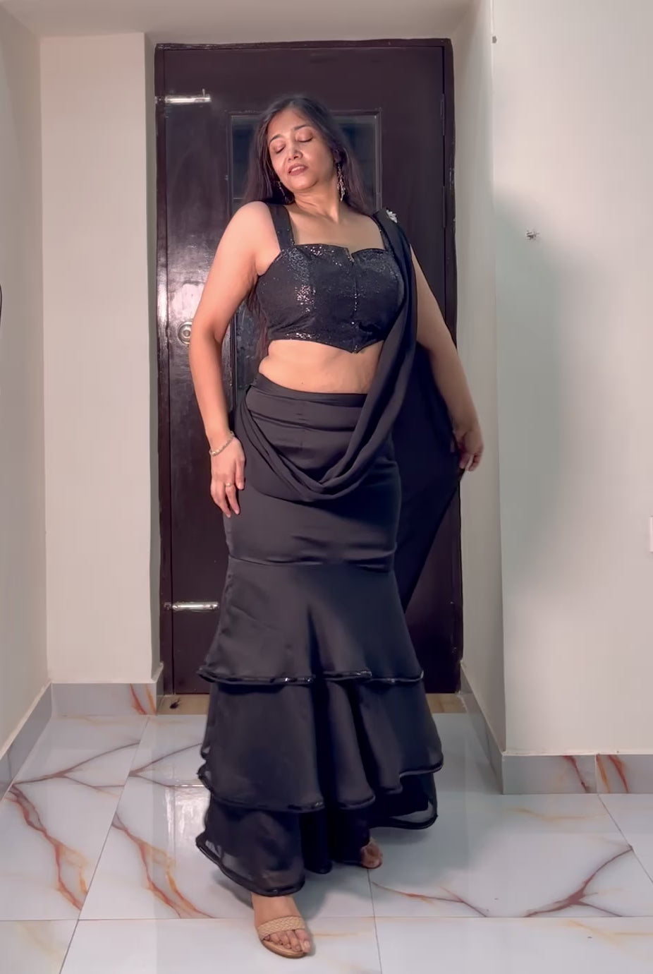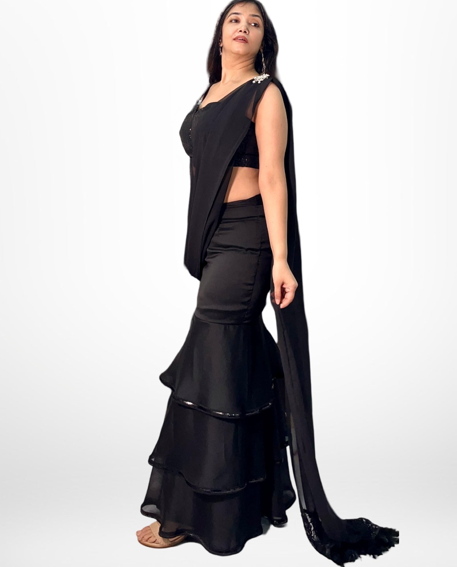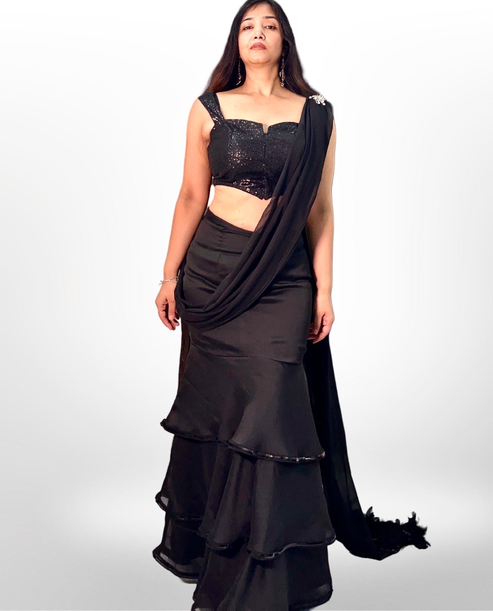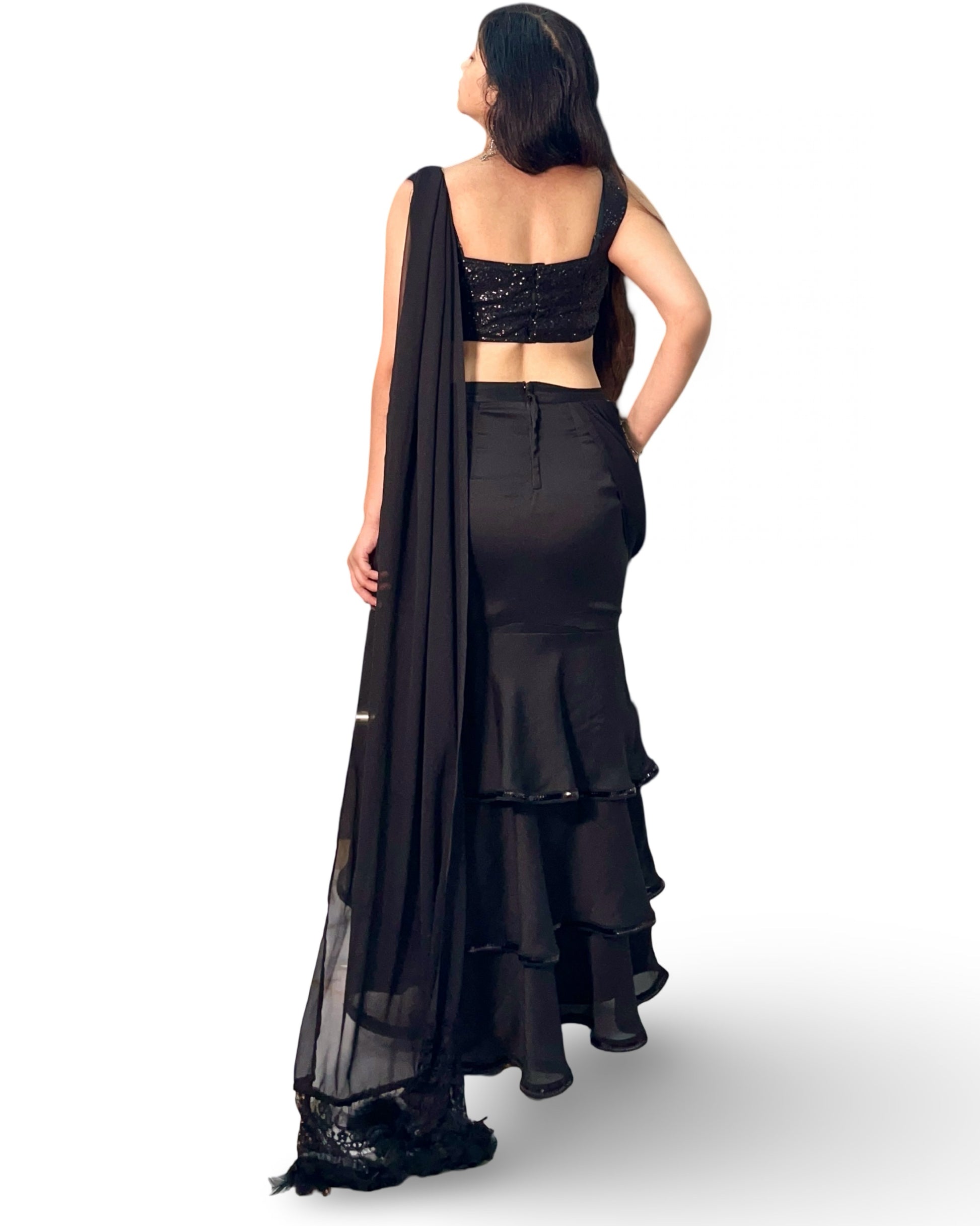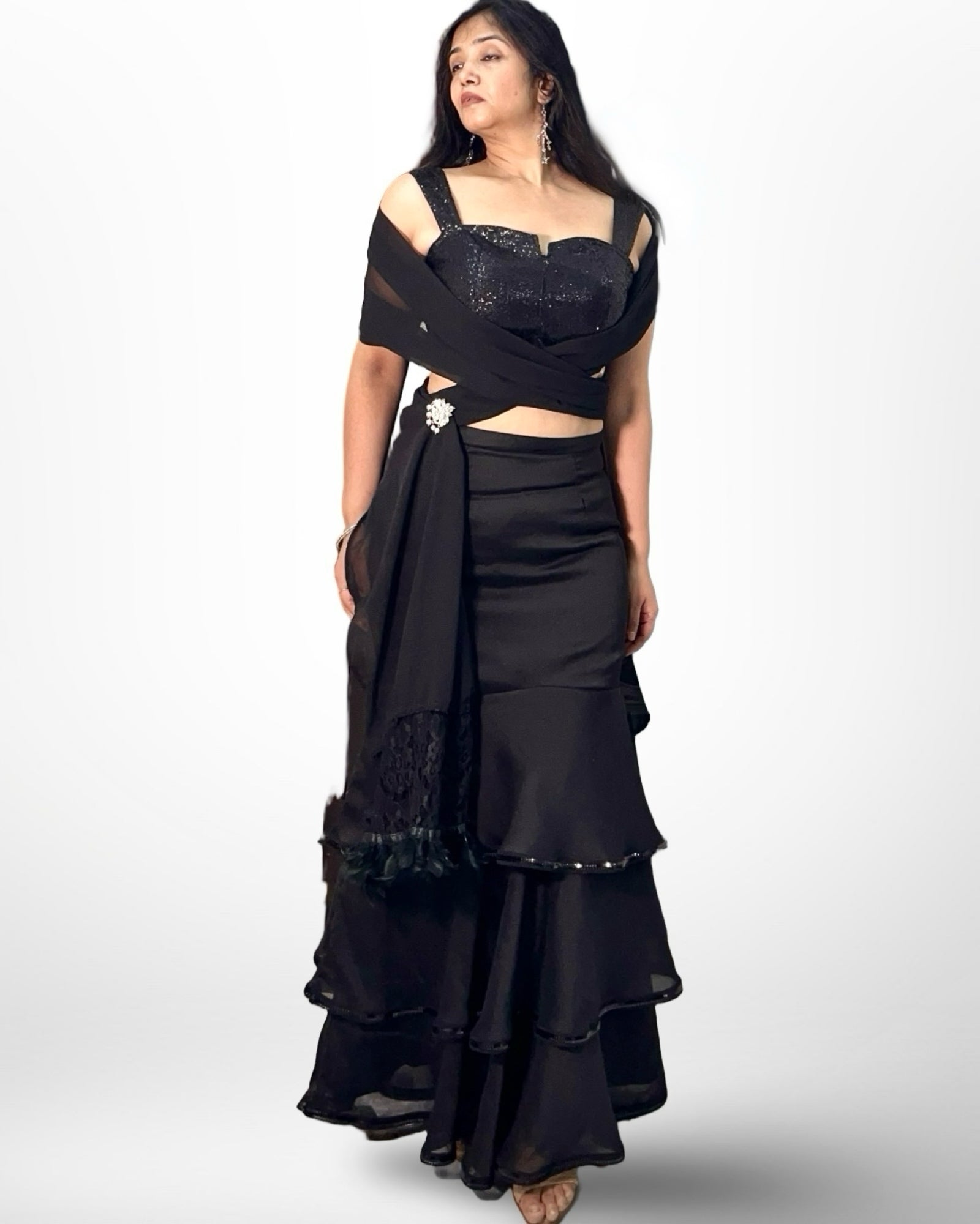 This elegant black glossy georgette saree ensemble features beautifully layered ruffles that add depth and movement. The stylish blouse is adorned with shimmering sequins, enhancing its sophisticated appeal. The dupatta is finished with delicate lace and feather detailing along the hems, creating a refined and unique look perfect for special occasions.