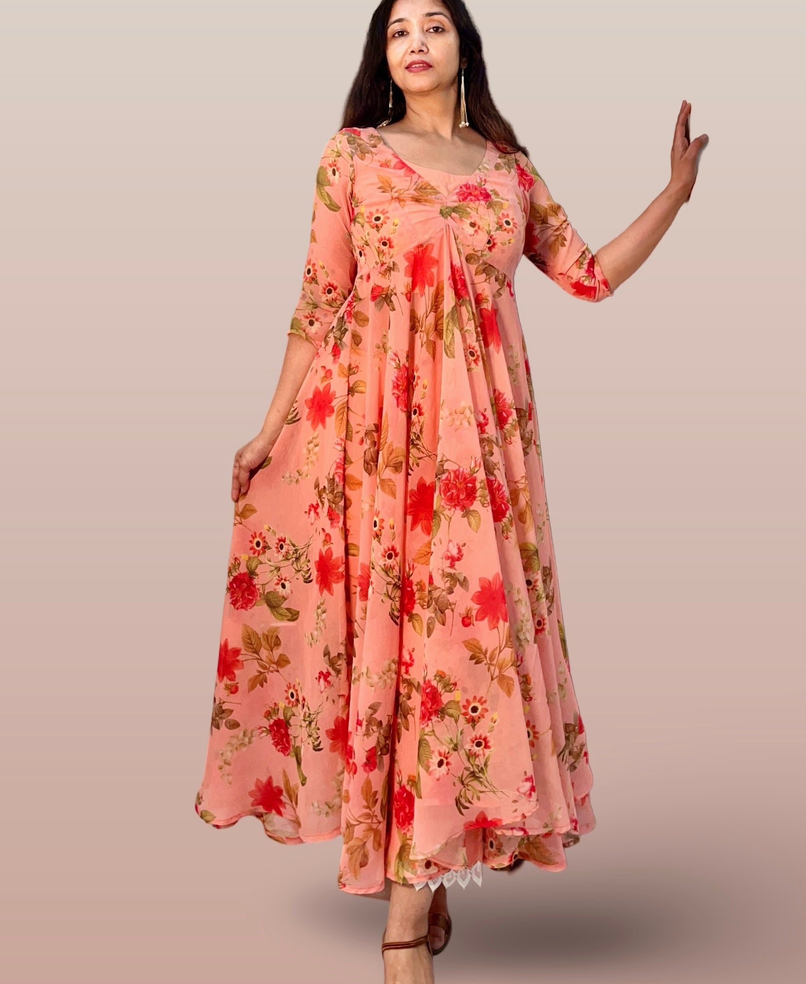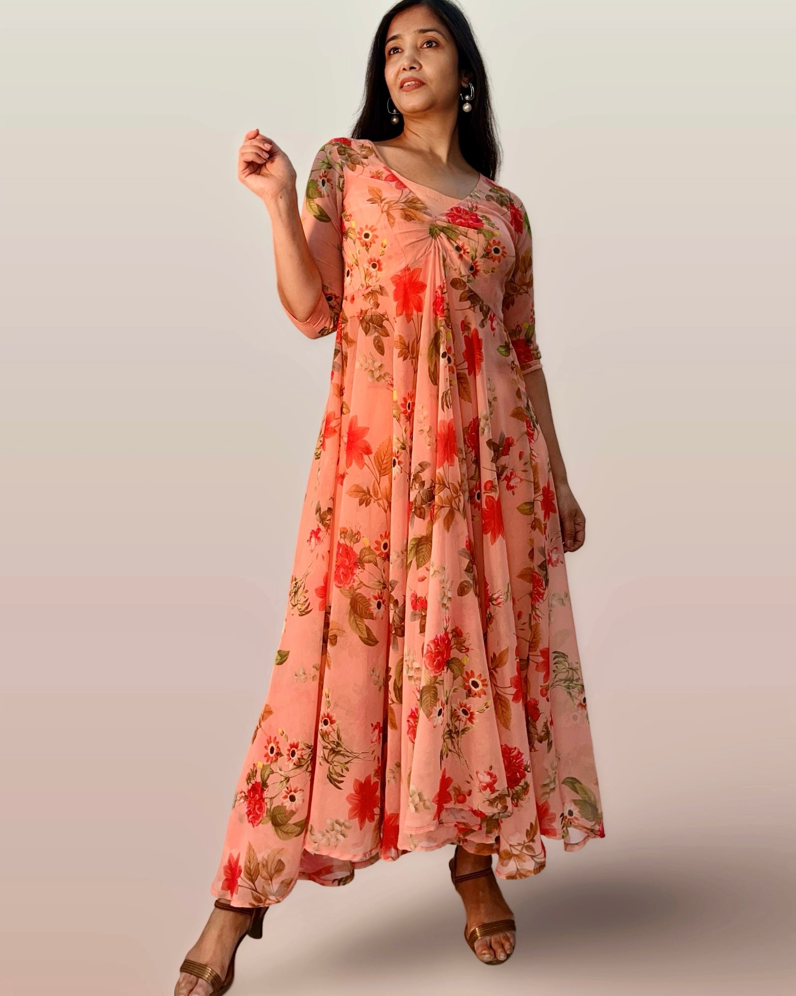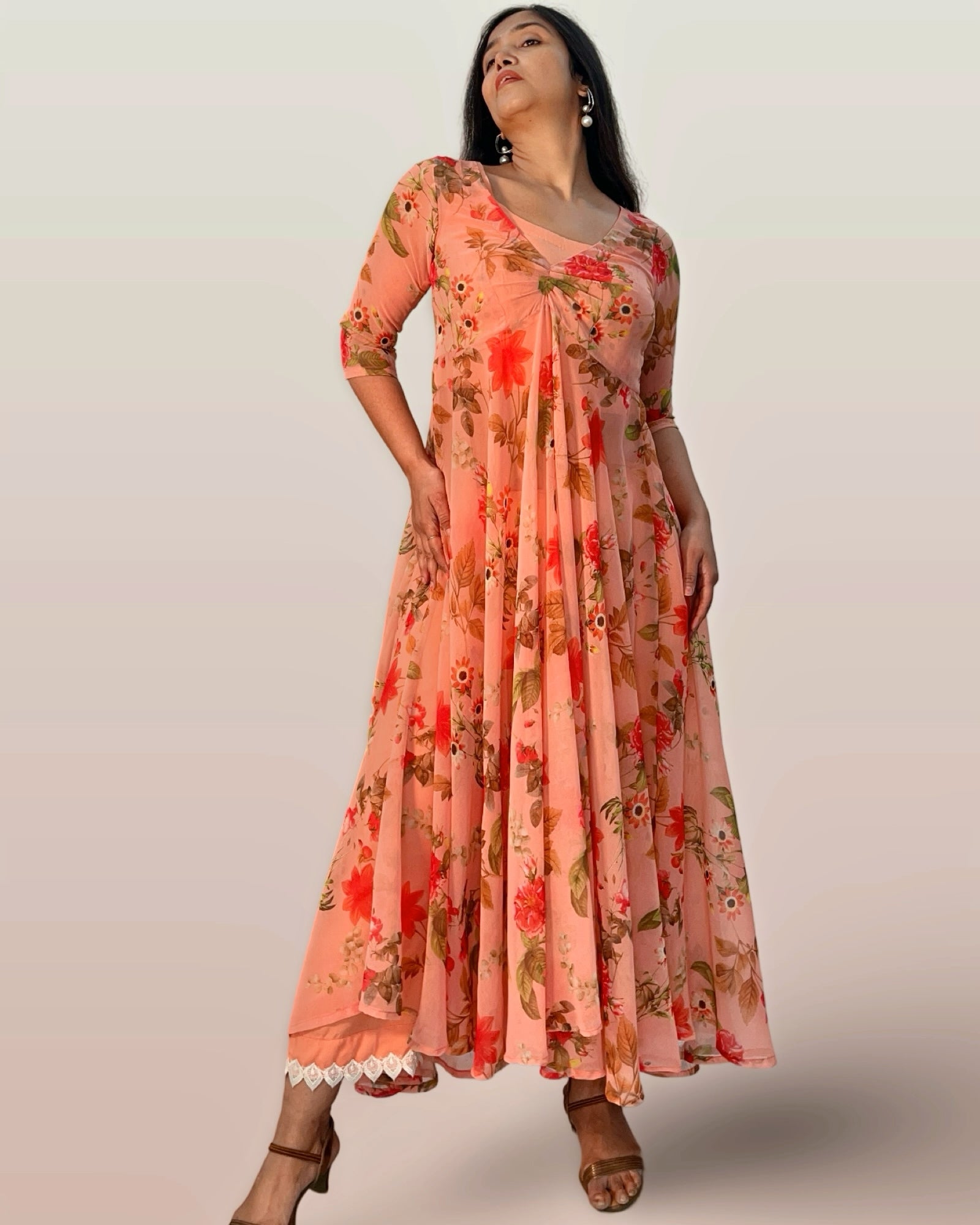 This elegant Indo-Western ensemble features a long, full-flared georgette tunic adorned with a delicate floral print, paired with a comfortable cotton inner blouse and matching cotton palazzo pants. The lightweight georgette fabric ensures graceful movement, while the breathable cotton lining and pants provide all-day comfort. Perfect for festive occasions or casual gatherings, this outfit combines traditional charm with contemporary style for a refined, sophisticated look.
