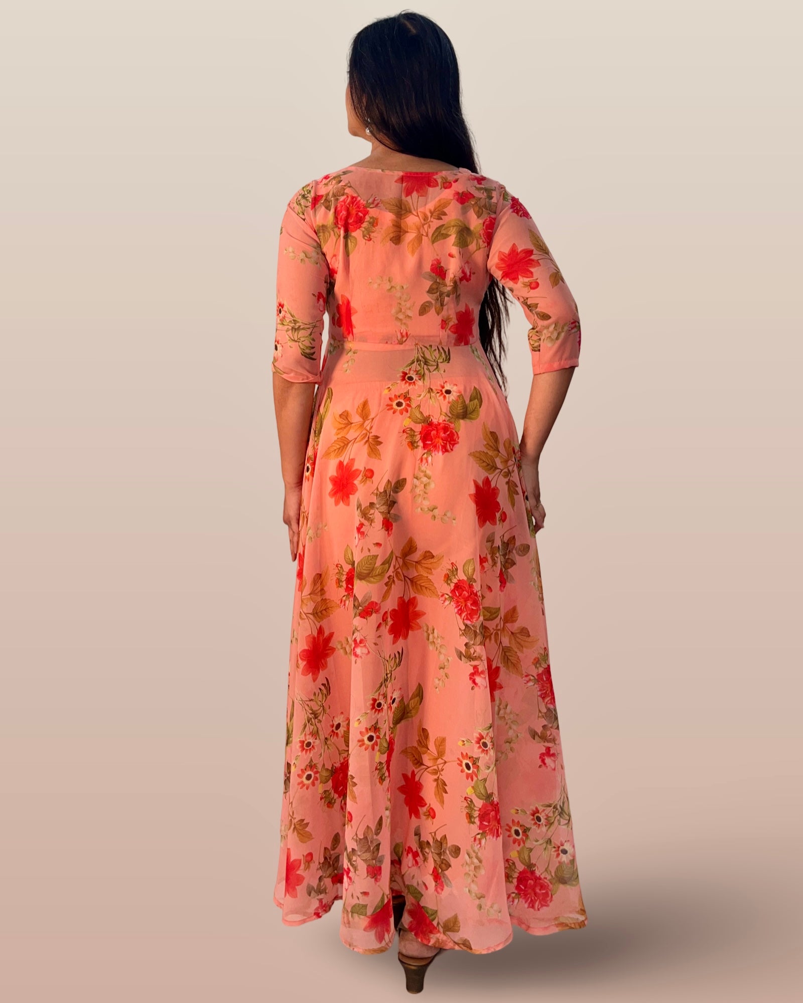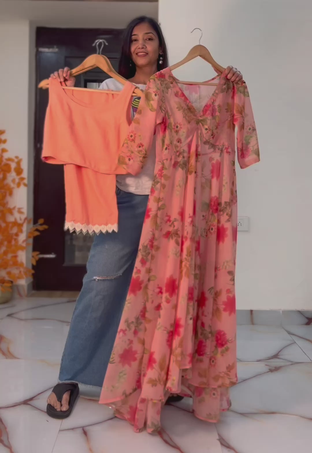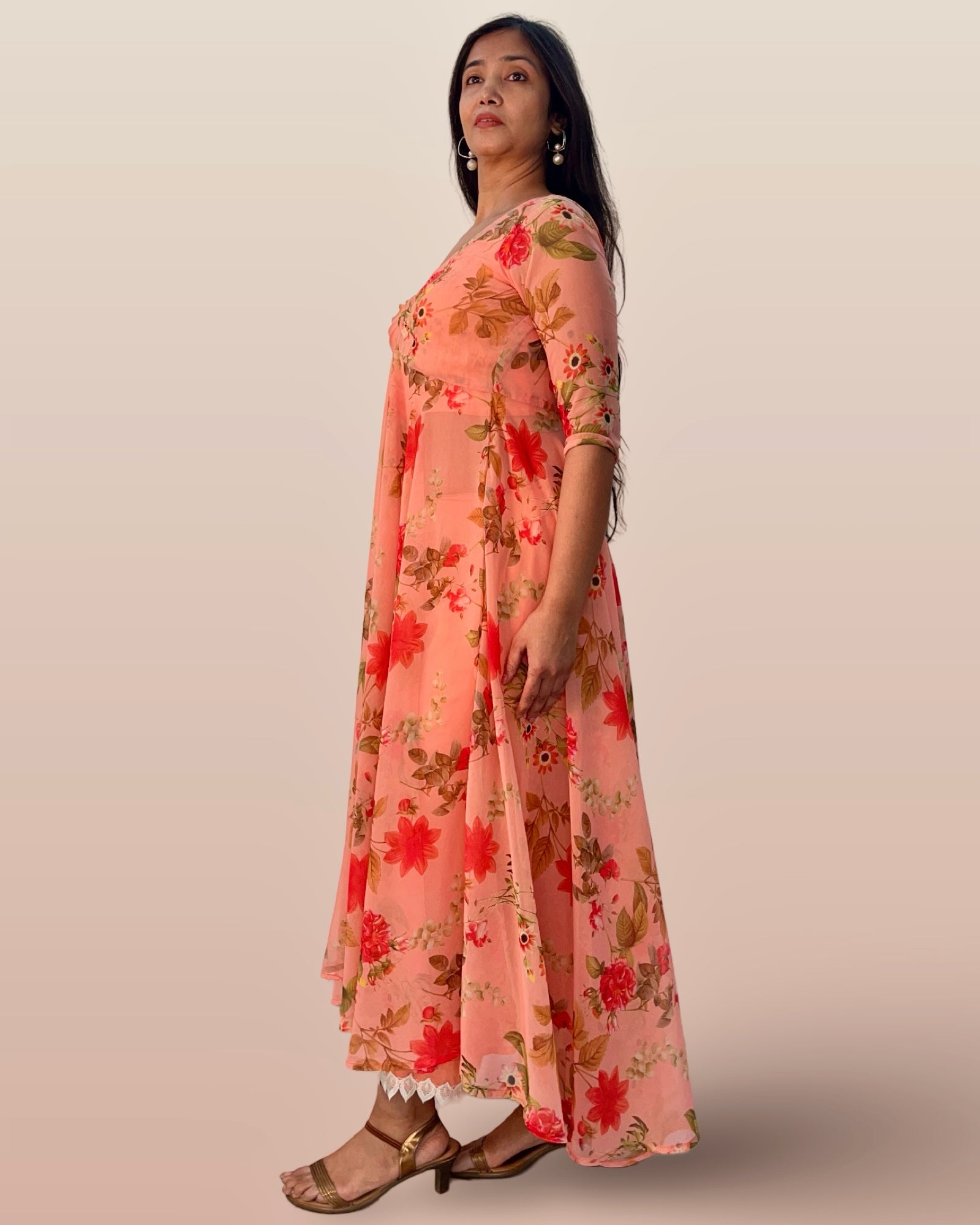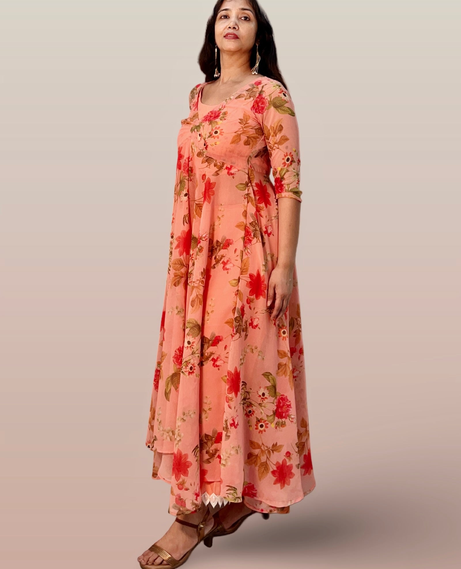 This elegant Indo-Western ensemble features a long, full-flared georgette tunic adorned with a delicate floral print, paired with a comfortable cotton inner blouse and matching cotton palazzo pants. The lightweight georgette fabric ensures graceful movement, while the breathable cotton lining and pants provide all-day comfort. Perfect for festive occasions or casual gatherings, this outfit combines traditional charm with contemporary style for a refined, sophisticated look.