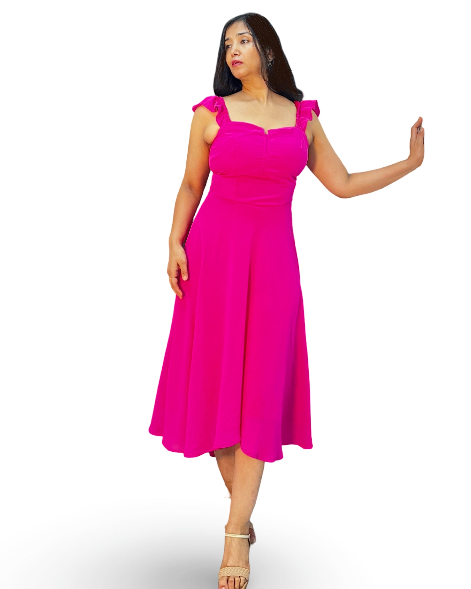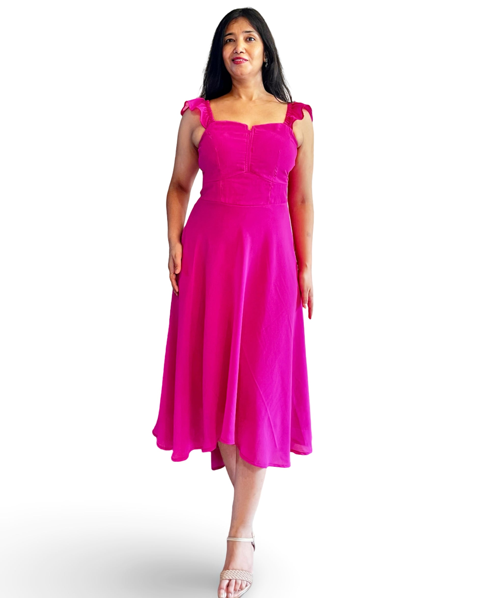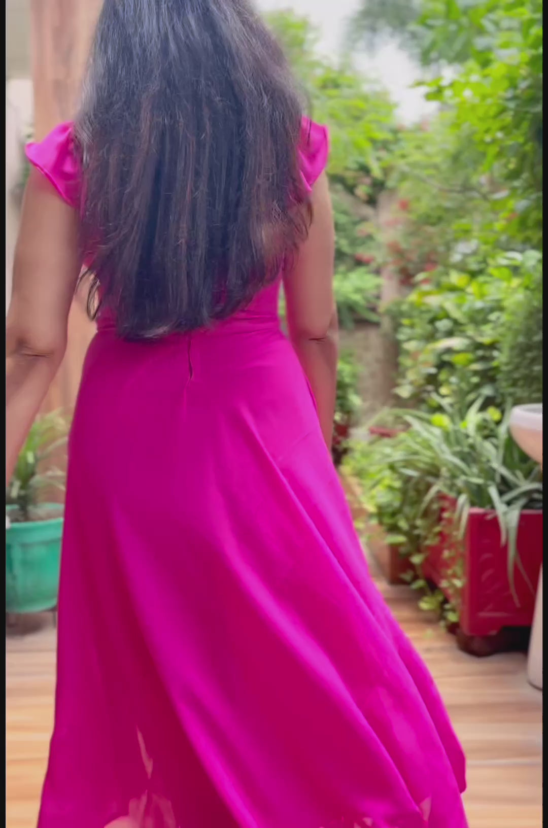This fuchsia pink georgette dress features a high-low hemline and a flared silhouette, perfect for summer occasions. Designed with delicate ruffled sleeves and elegant straps, it offers both comfort and style. The lightweight fabric ensures breathability, making it an ideal choice for warm weather while adding a graceful, flowing movement to your look.