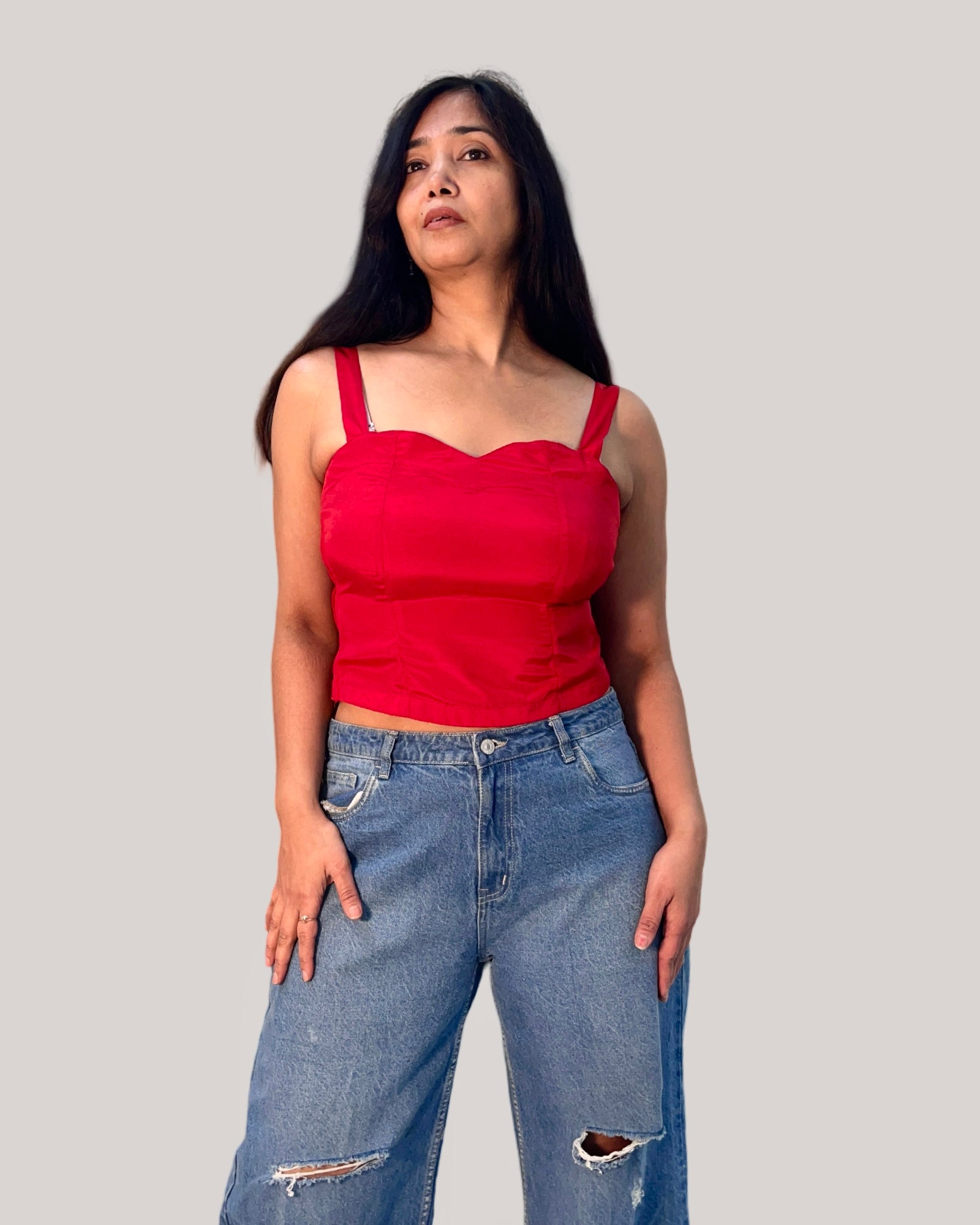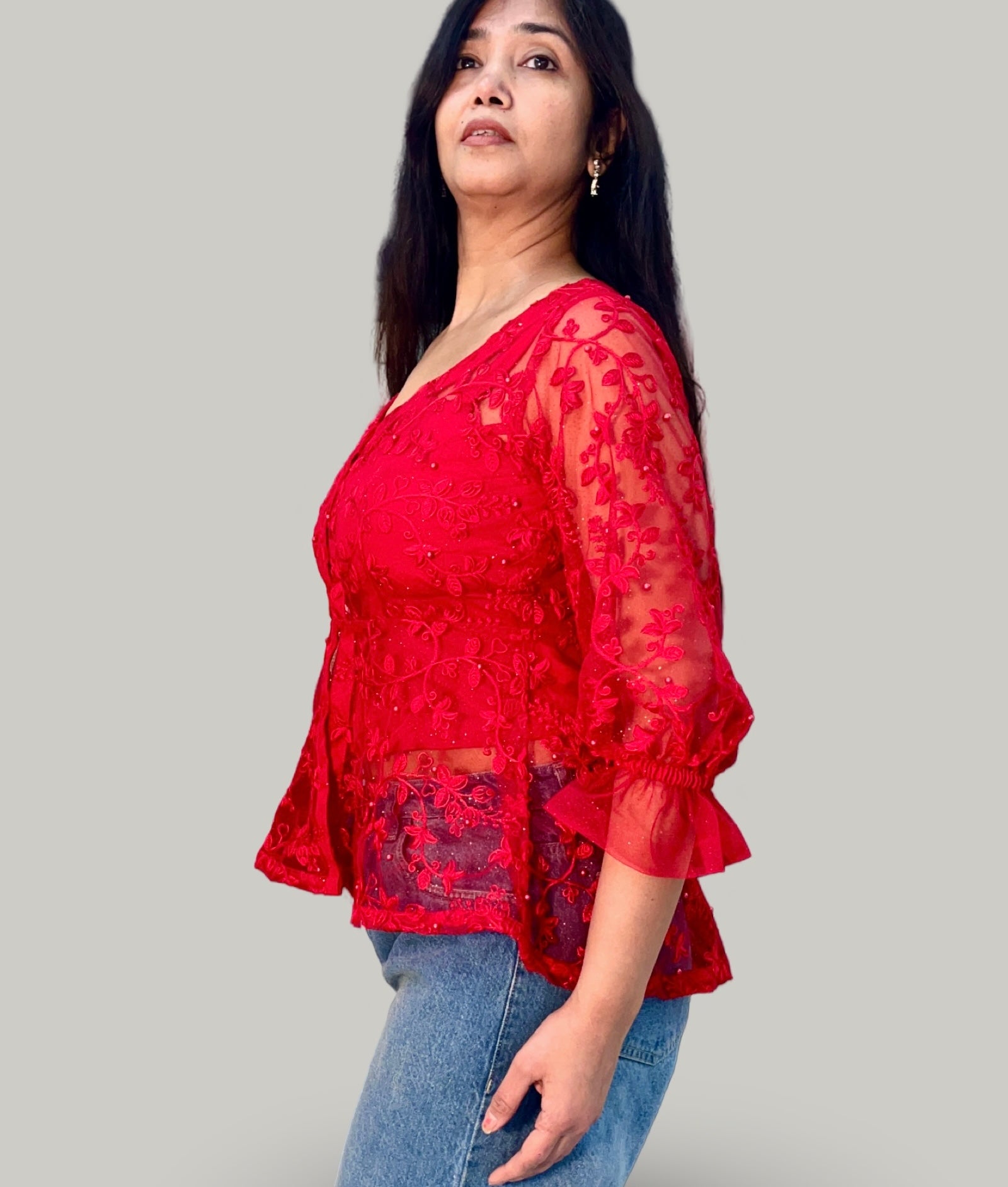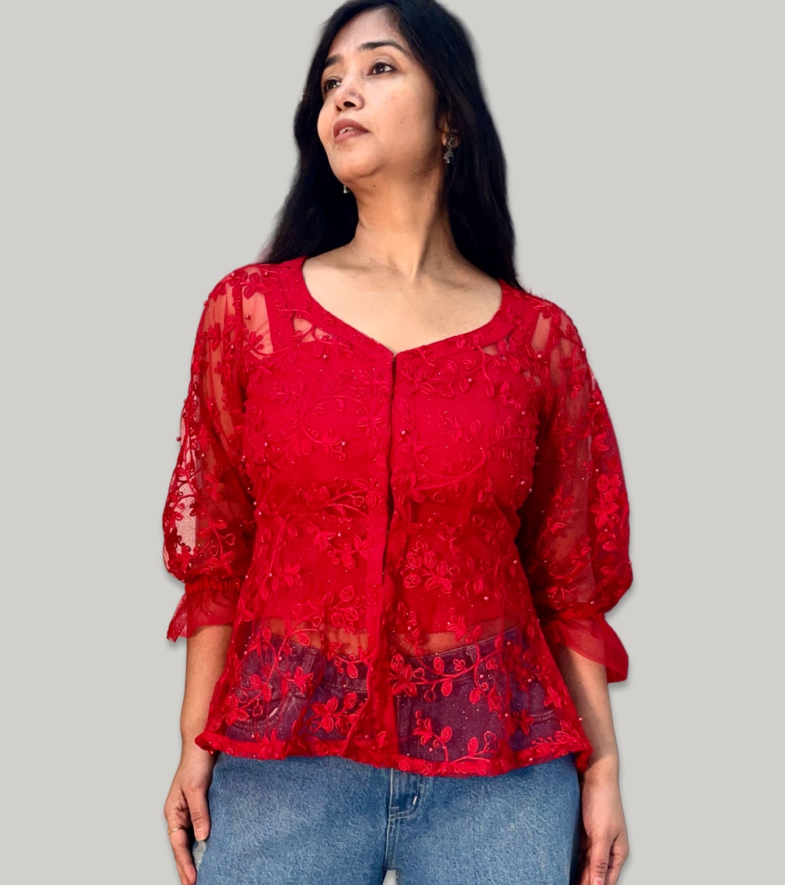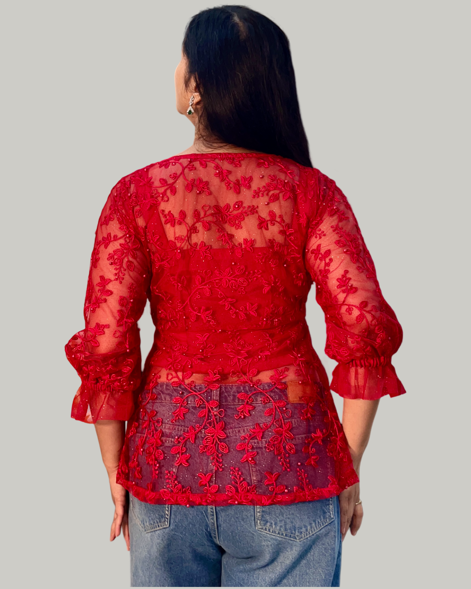 Red embroidered sheer net front open top with satin crepe inner