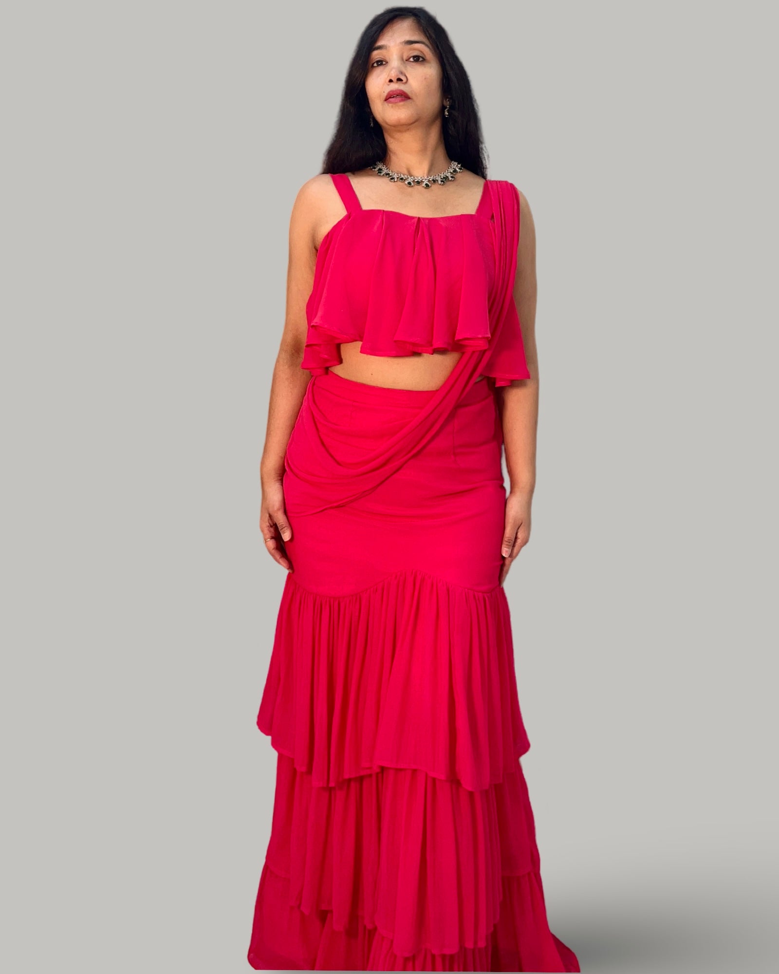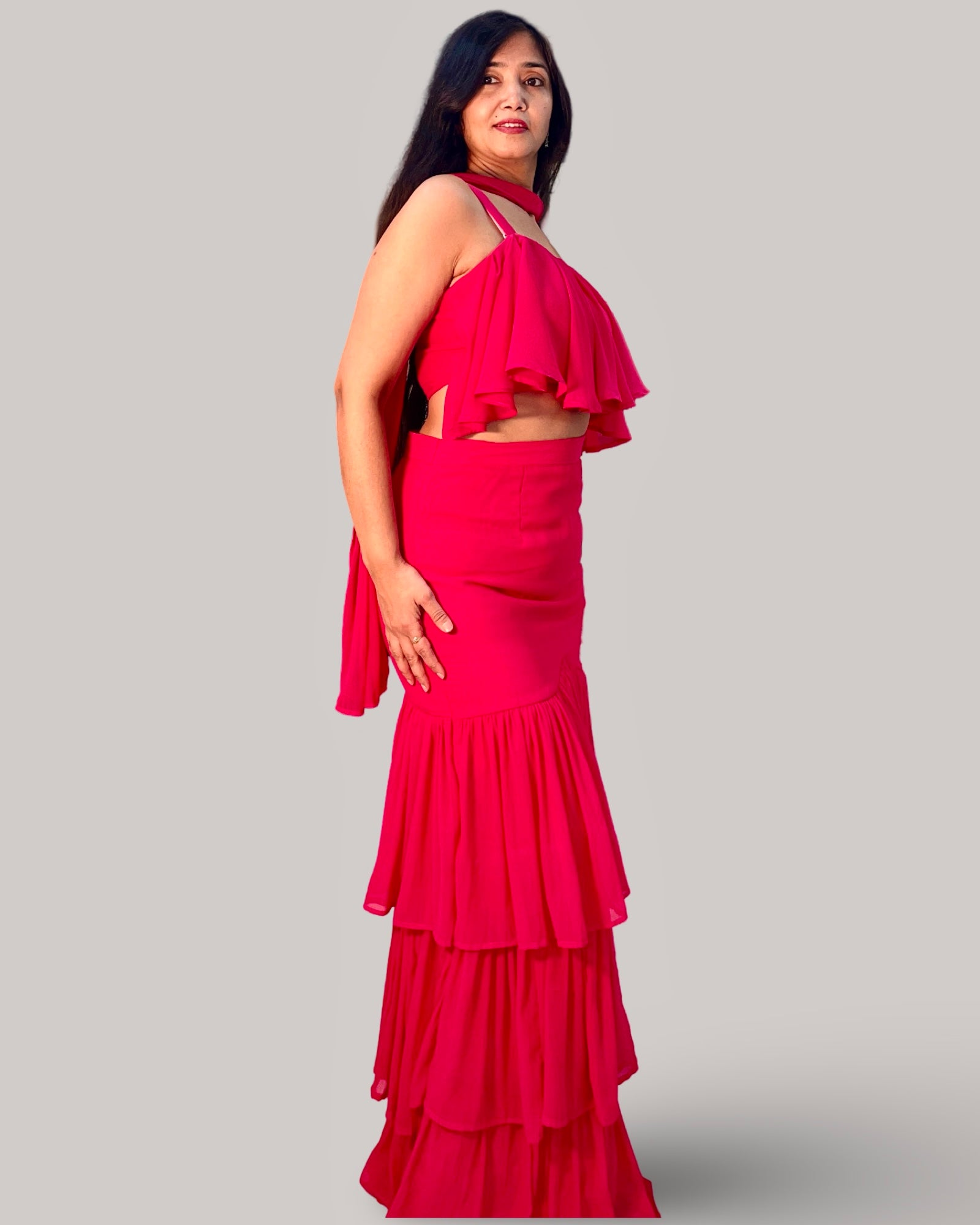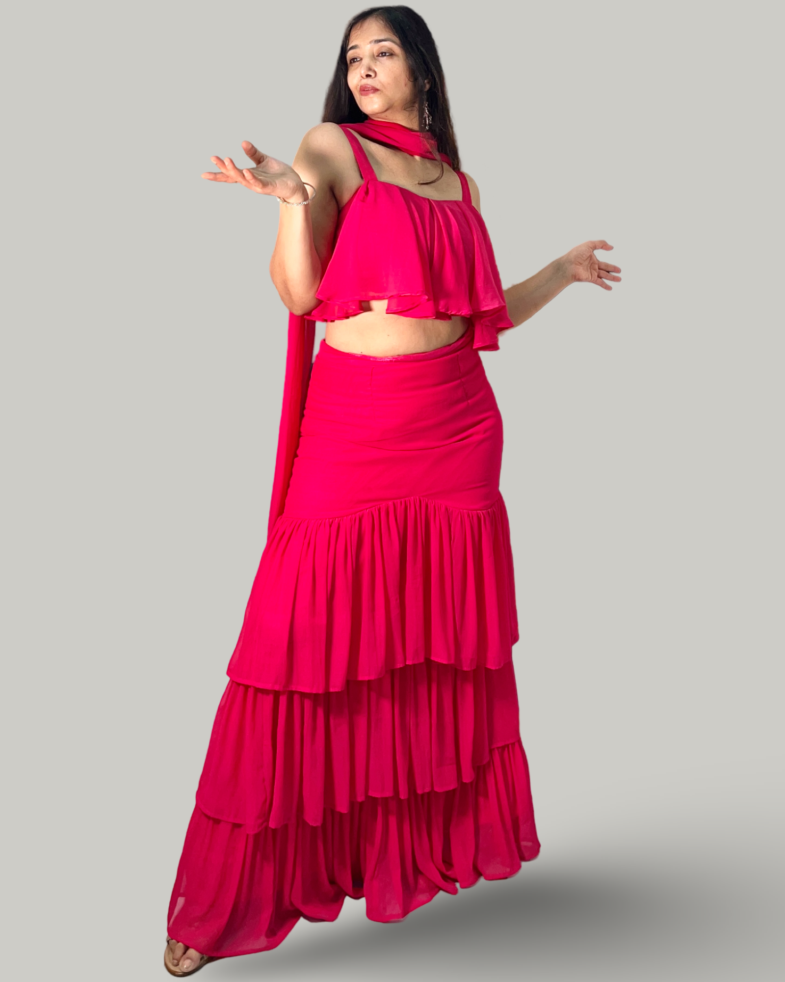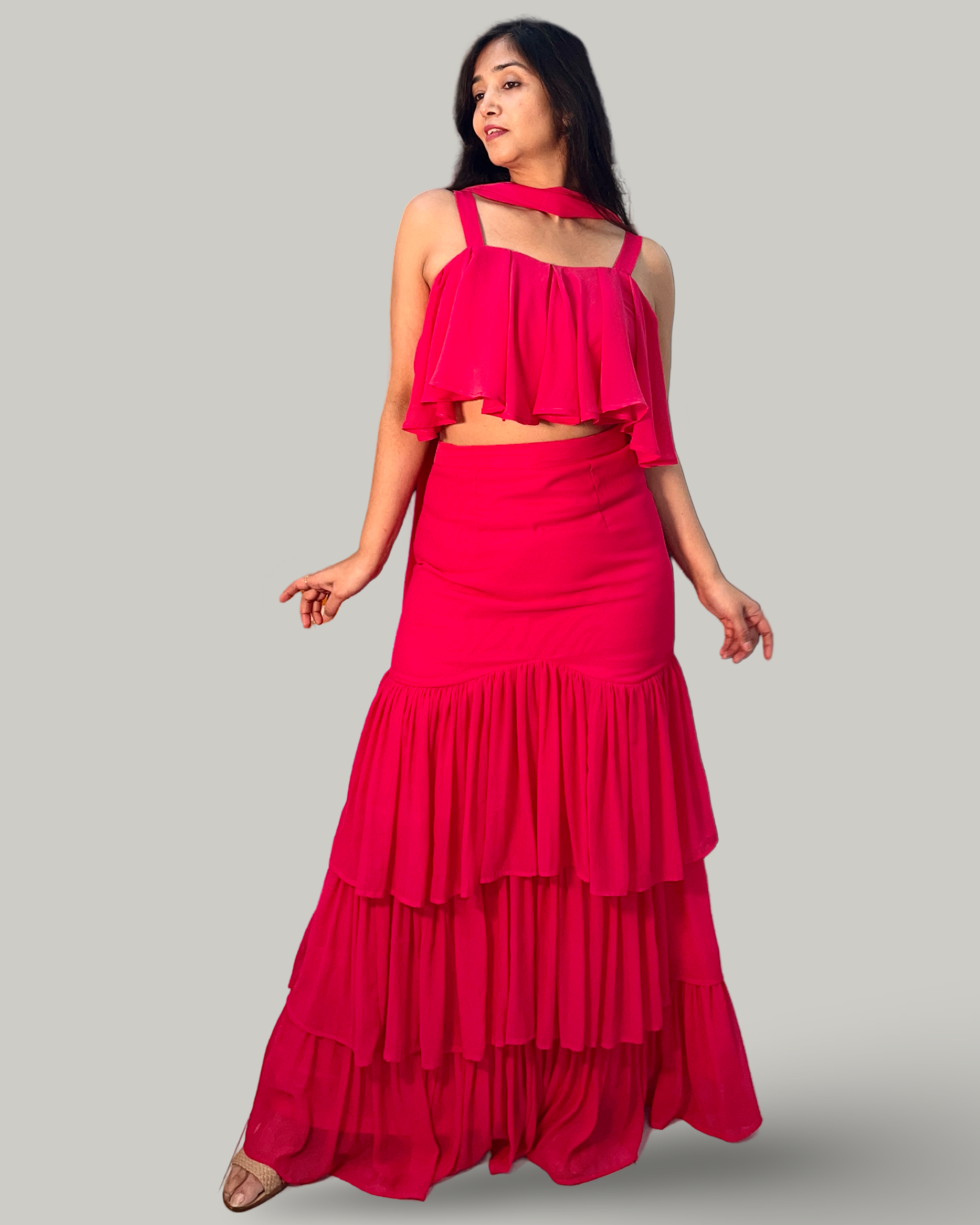 Make a bold statement in this vibrant magenta georgette ensemble,featuring a breezy layered crop top paired with a multi-tiered skirt.Crafted for  modern elegance,the playful ruffles and soft silhouettw add a touch of romance,making it perfect for festive evenings,resort wear,or statement daytime looks.Thin georgette dupatta is paired with the ensemble which can be styled in various ways.