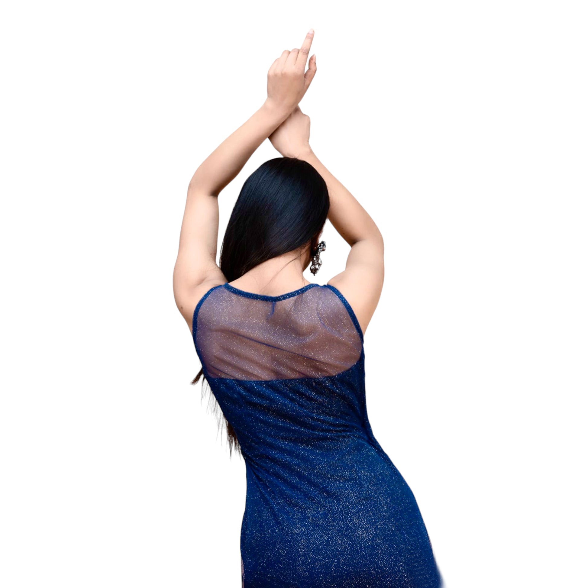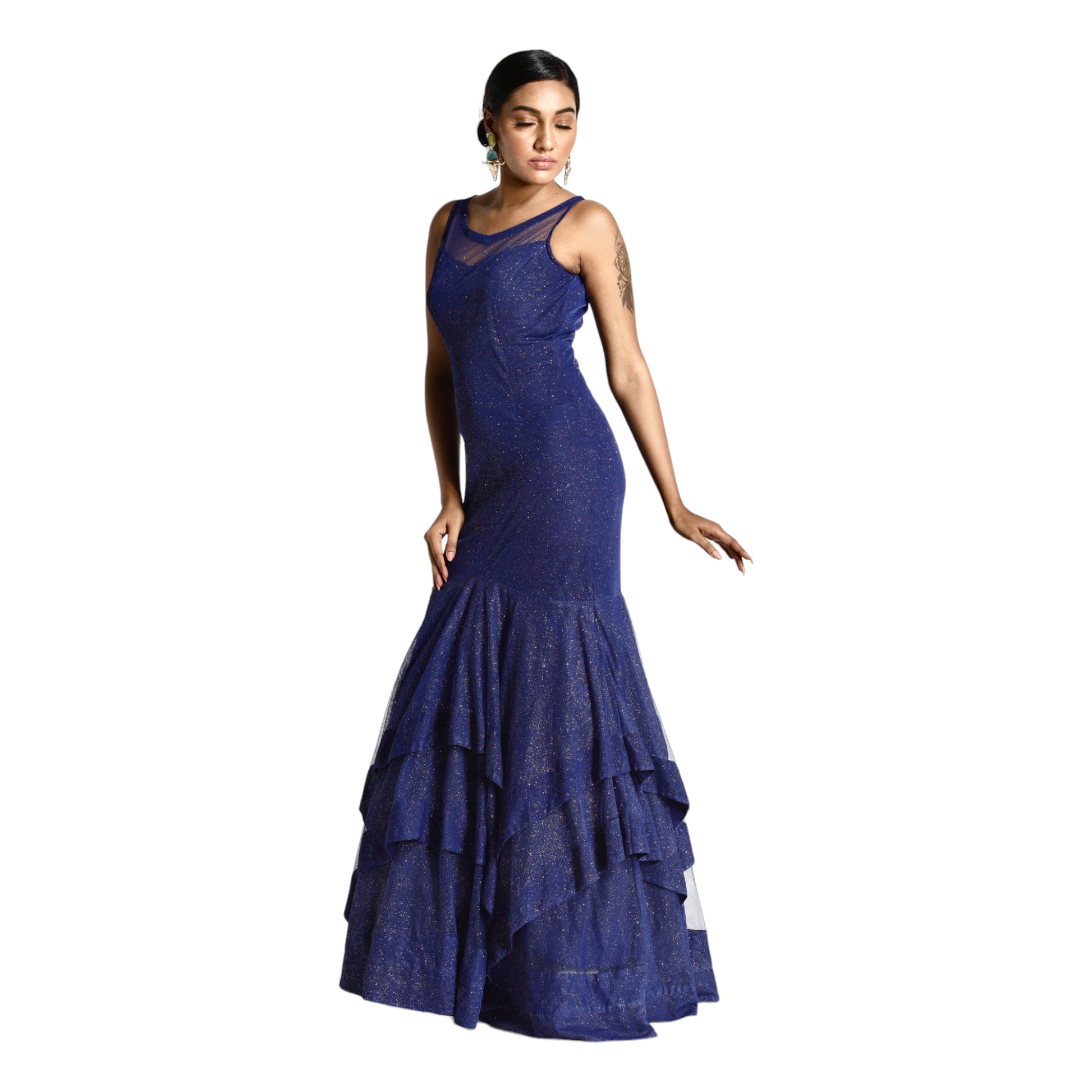 This midnight blue mermaid-style evening gown features multilayered ruffles crafted from delicate net fabric, creating a striking silhouette perfect for special occasions. The padded bodice offers structured support, while the attached can-can underlayer adds extra volume to the skirt, enhancing its dramatic flair. Made to order, this gown ensures a tailored fit that complements your figure with elegance and sophistication. Ideal for those seeking a refined and standout partywear piece.