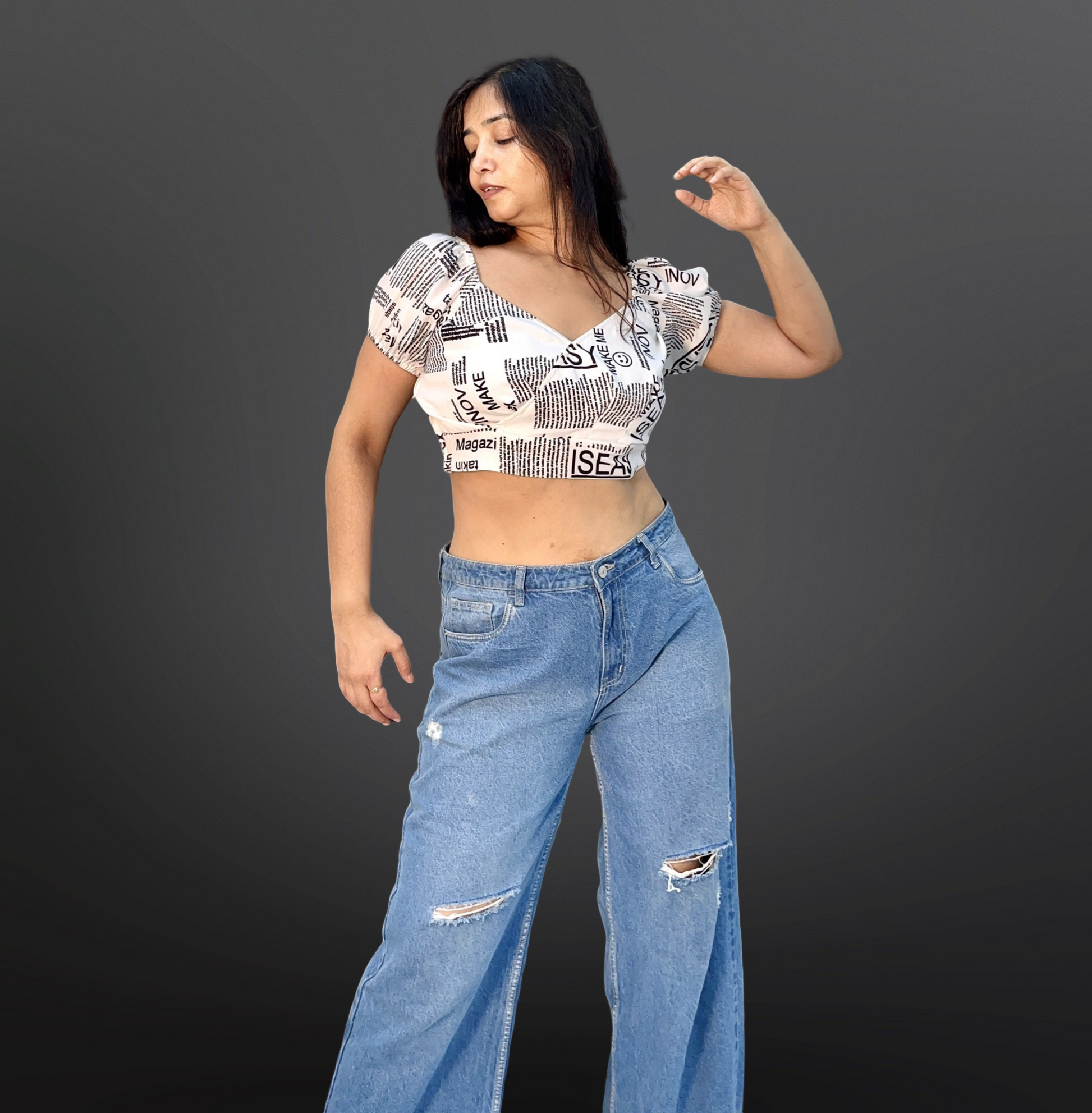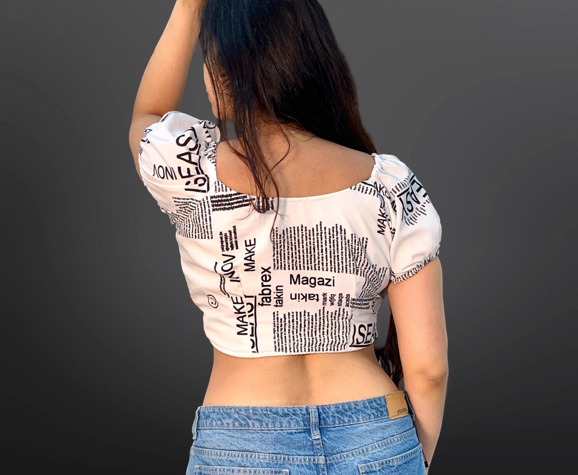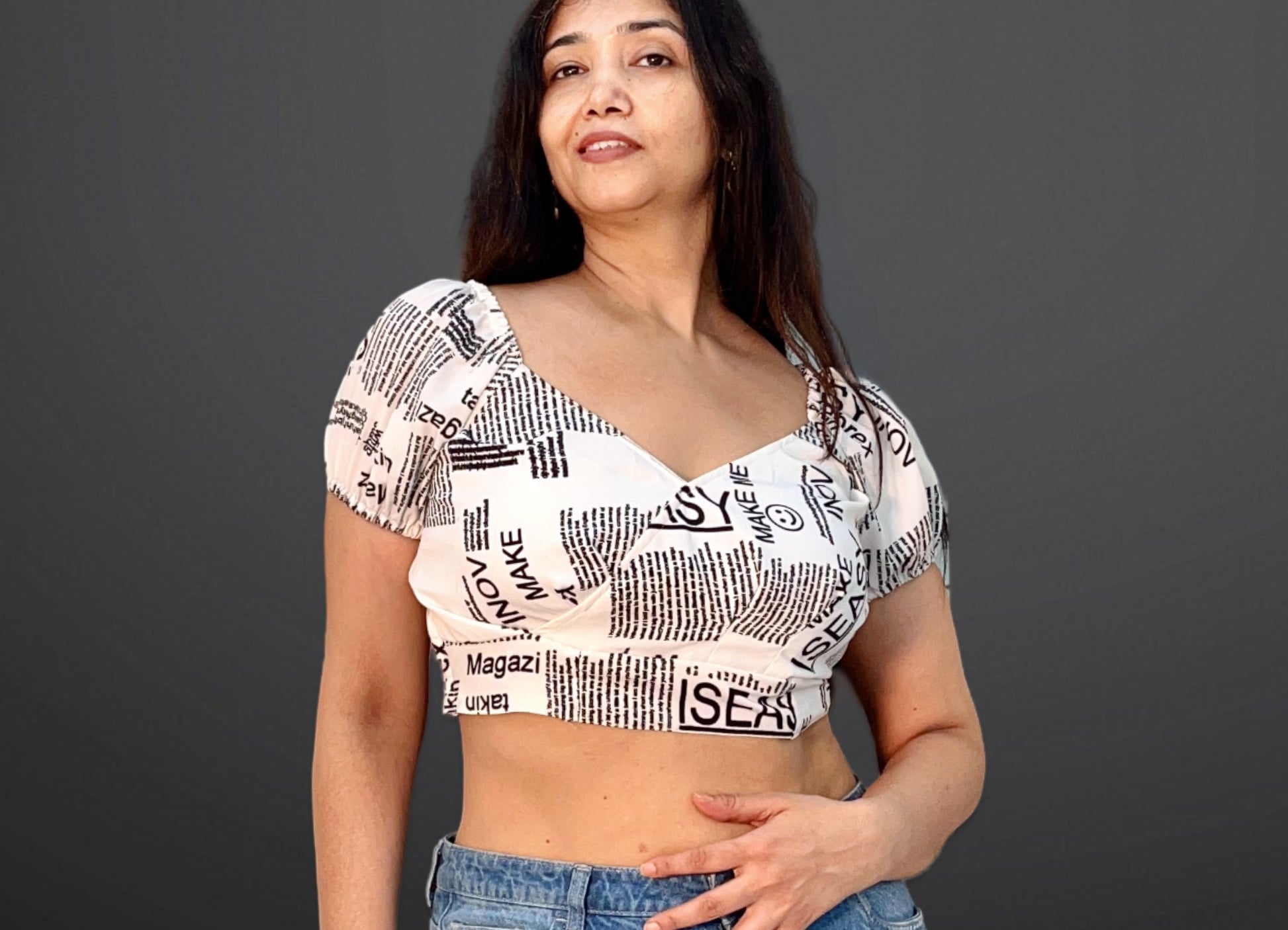 This semi-crepe wrap crop top features a distinctive newspaper print, combining contemporary style with a lightweight, breathable fabric. Its wrap design allows for an adjustable fit, enhancing comfort and silhouette. Perfect for pairing with high-waisted bottoms, this top offers a chic, modern look suitable for casual outings or stylish daywear.